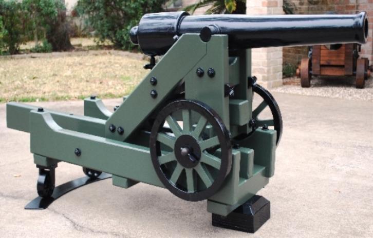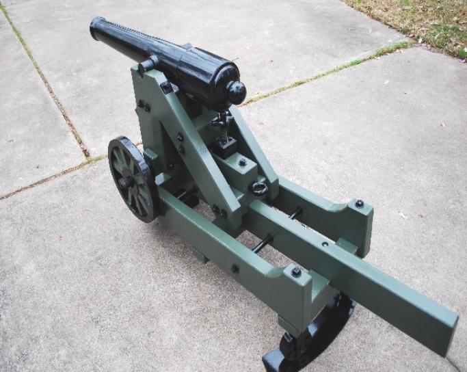 | 1/3 scale 100 Pounder Parrott rifle on front pintle Barbette carriage. The barrel is 43" long. This all wooden construction, non-firing model, has a black enamel paint finish on the barrel, wheels, trim and green finish on the carriage. This civil war cannon was mounted on land fortifications. This piece was made as a working piece that will slide forwards and backwards by turning the cannon mount wheels as did the original piece. A beautiful example of an historic piece. $3100.00 (Overall length is 62", 26" wide, 33" tall, weights 97 lbs.) |