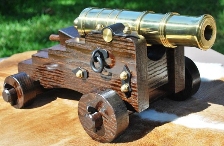 This is a replica black powder FIRING, brass, "Brook's USA" 24 Pounder barrel with a 1" bore. It's weight is approx. 16 pounds of hand crafted brass. Length is approx. 13" and diameter is 3" at the breech. This firing carriage is made of oak & custom made by me specifically for this barrel. Overall dimensions mounted is approximately 14" wide, 19" long, 10" tall & weighs 28 lbs. We can now offer a Brooks 24 pounder brass barrel mounted on one of my custom beautifully crafted naval carriages. The hand forged iron is painted flat black with brass accent pieces and the carriage is stained Jacobean. This solid oak carriage replica models a typical British four wheel carriage used on board ships in the 18th and 19th centuries. Recoil and repositioning was controlled with ropes and blocks secured to a bulkhead wall. The barrel is the Brooks USA 24 pounder with a one inch bore, machined of 3" diameter solid brass stock and known as the Brooks Golden Gun. $ SOLD $ Implements are optional to order. |