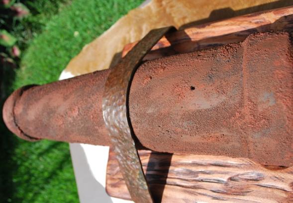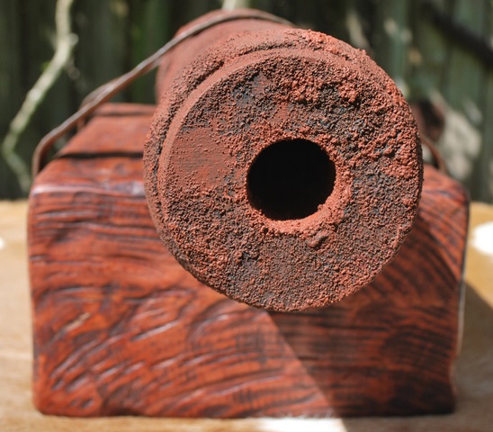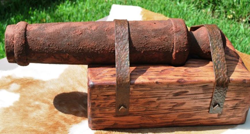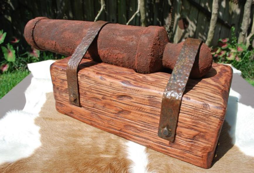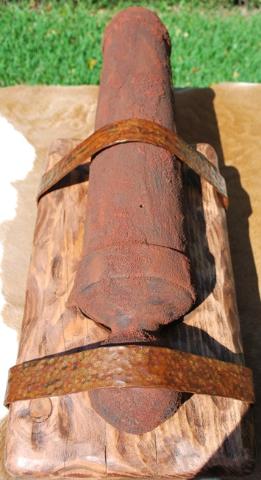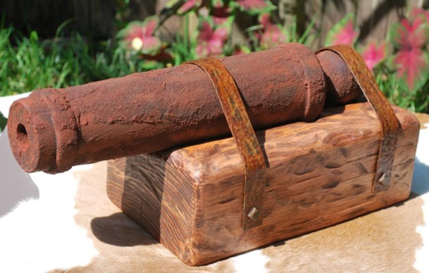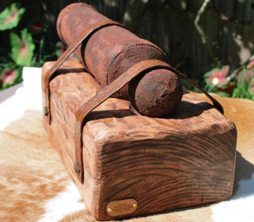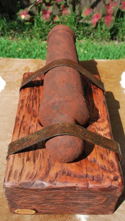 This replica cannon is based on the "Come and Take It" cannon barrel in the museum in Gonzales, Texas. An important part of Texas history, this wooden barrel is full scale at 21 ½” long and 3-7/16" diameter at the muzzle the same as in the museum. Due to the size of the original carriage I opted to have the cannon mounted on a wooden stand instead of a carriage. The “stand” mimics the way the barrel is mounted on the carriage in the museum. The wood barrel is aged & faux painted and the metal straps are hand forged then aged for the historic nostalgic look to make it look like it came out of a river bank just as the original. The size of this piece will display on a table, desk or credenza nicely. $600.00 each 2 in stock (weighs approximately 28.6 pounds) |