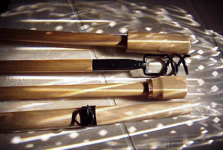 | Oak Heads - This set of Ramrods are made to regulation size and length for a "3" inch bore cannon. A civil war reenactor would also be proud to own and use this set on the battlefield or as presentation pieces. The ramrod heads are made of oak with walnut pegs and the rod staffs are made from oak. The whole set is made of solid oak then coated with linseed oil. - Email or Call to Custom Order & Pricing - * The Trail Spike shown is priced on request and is sold separately. Ask for pricing. |