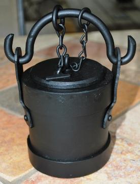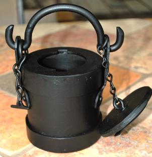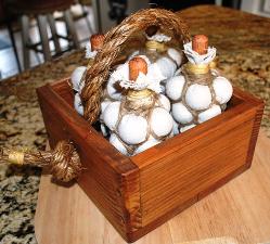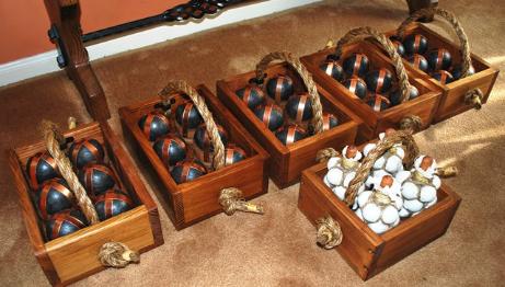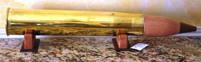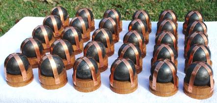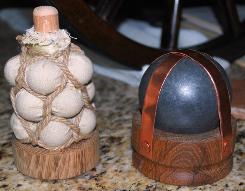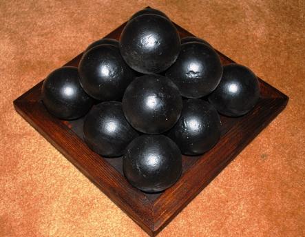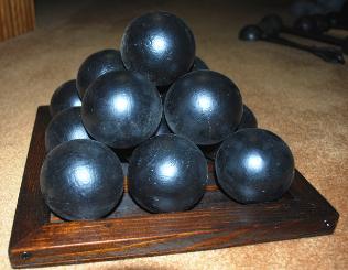 A customer ordered 4-Grape Shots, 30-Cannon balls with Sabot option, 2 double head ram rod sponges, worm, leather vent cover, and tampion with leather cover. In addition he bought one of my Ammunition Chests, a Texas Granite trivet on a stand and a 105 MM Tank Shell that I had on display for sale. The Sabots were fabricated for a 3" bore and copper band strips with copper nails hold it on the oak wood cup base. I made boxes so that 6 sabots each could fit in snuggly to be carried easily because they weighed 5 pounds each. All the lead balls were aged treated for that period look and all the sabot cups were oiled. The ram rod implements were stained Jacobean color with copper bands, sponge socks, and I had soft velour bags made to put them in for transport to the customers home via personal jet. |