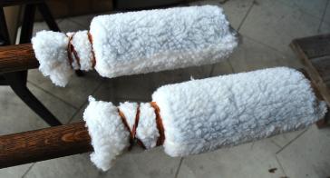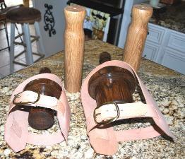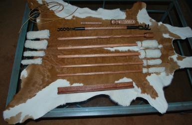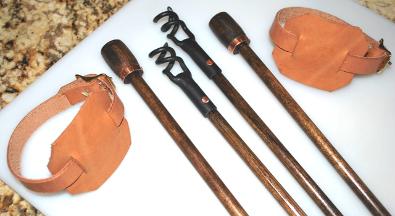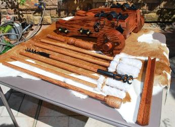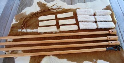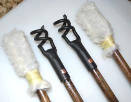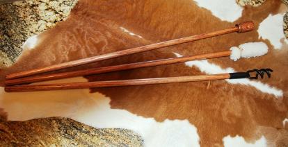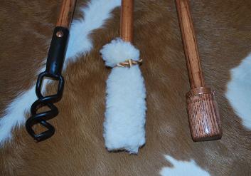| I made 2 oak wood implements -worm head on one side and sponge head opposite side, Ram rod head and sponge head on 2nd rod. The implements come with 3 sponge socks each and leather ties, |