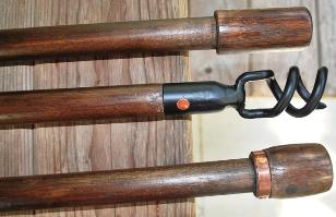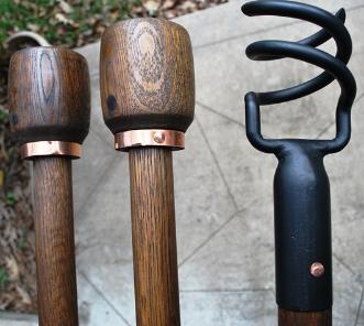 | 3 Implements made for a customer with a 1/2 scale 1841 Six Pounder with a 1-5/8" bore - Ramrod, Sponge, Worm made of oak wood with copper nails holding on copper bands. Metal Head on Worm. |