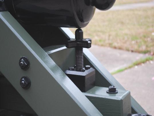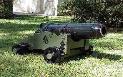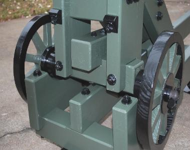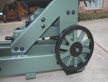 | 1/3 scale 100 Pounder Parrott rifle on front pintle Barbette carriage. The barrel is 43" long. This all wooden construction, non-firing model, has a black enamel paint finish on the barrel, wheels, trim and green finish on the carriage. This civil war cannon was mounted on land fortifications. This piece was made as a working piece that will slide forwards and backwards by turning the cannon mount wheels as did the original piece. A beautiful example of an historic piece. $3100.00 (Overall length is 62", 26" wide, 33" tall, weights 97 lbs.) |
