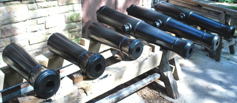 Non- Firing - This is the front 30" of a muzzle on a full scale size 1841 six pounder barrel. The barrel is 30" long with a 3" bore. The barrel is made out of concrete and cannot be fired. Barrel weighs 88 pounds. I made these for a pirate ship display at the Texas Renaissance Festival. The display called for short barrel pieces to be displayed pointing through gun ports. Only the muzzle can be seen from the outside of the ship. These short cannon sections can also be used as bollards. They would look like cannon barrels set in concrete as seen in many towns throughout the Caribbean Islands. These are great display pieces. Use your imagination. $250.00 each cannon barrel (Overall length is 30" and 10" wide at the end of the barrel.) |