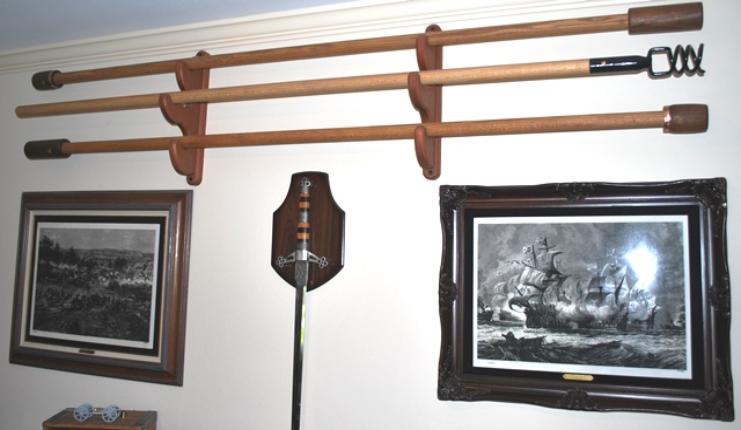 Walnut Heads - This set of Ramrod civil war implements are made to regulation size and length for a "3" inch bore cannon. A civil war reenactor would be proud to own and use these artillery implements on the battlefield or as presentation pieces. The ramrod heads are made of walnut with oak pegs and the rod staffs are made from oak. The whole set is made of solid oak and walnut woods then coated with linseed oil. - Email or Call to Custom Order & Pricing - Mount shown is optional - ask for pricing |
