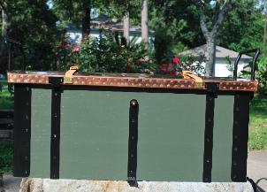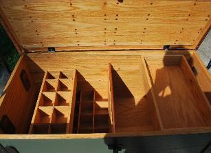| Another regulation made oak wood Limber Chest made to drop right on to any properly made limber. The outside is stained an oak color with black metal trim and the inside is linseed oiled. The Travel Cover was made of treated duck canvas with brass grommets and leather reinforced trimmings that are all hand sewn with sinew thread. |