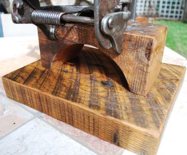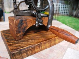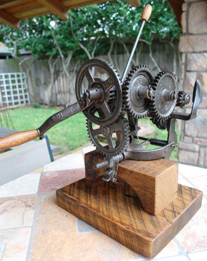 | "The Sickle Blade Sharpener" This intricately geared piece of farmland history is for sharpening the sickle blade on an old horse drawn hay mower. In raised lettering, on top, it says, “McCormick-Deering” Chicago U.S.A Another “rescue”, this came from a junk pile in rural West Texas. It was completely disassembled, cleaned up and reassembled. I added new oak handles. It is completely functional, linseed oil is wiped on all metal & wood parts to maintain the antique luster, and the base mount is an aged piece of white oak. A grand display piece from a time in America’s history when equipment was made to last, this could sharpen a sickle blade today. It stands 21” in overall height and weighs 25 lbs. Price is $450 |