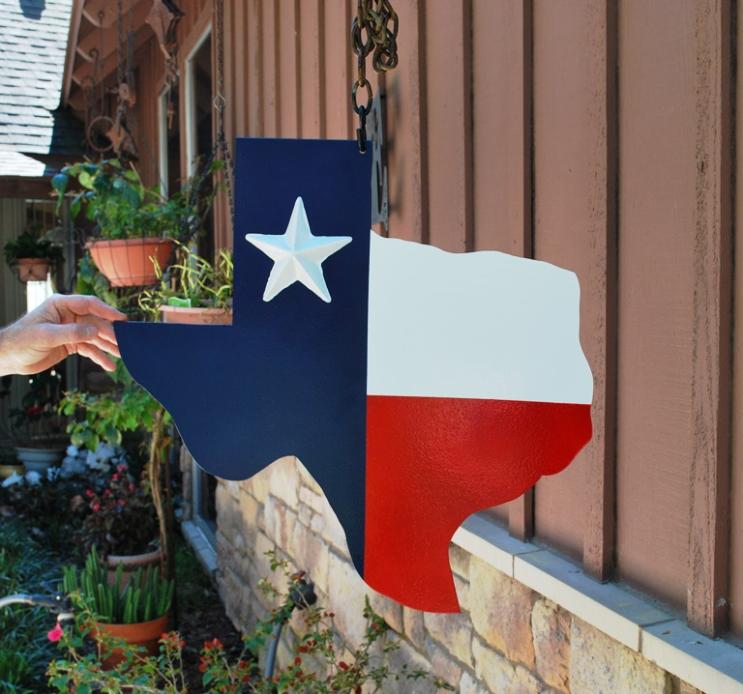 | Texas Shaped Wall Hanging - Three colors in this Texas shape with a white accent star could be a wall hanging or it could hang from the heavy link chain as shown in the picture. May be placed inside or outside. Made of 1/8" heavy plate metal, painted gloss enamels in red/white/blue on front and a semi gloss black enamel on the back. One drilled hole on top with chain link is ready to hang. Dimensions = 22-1/4" wide x 21" long Weight= Price $140.00 |