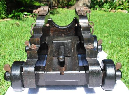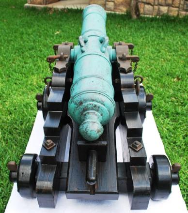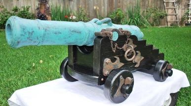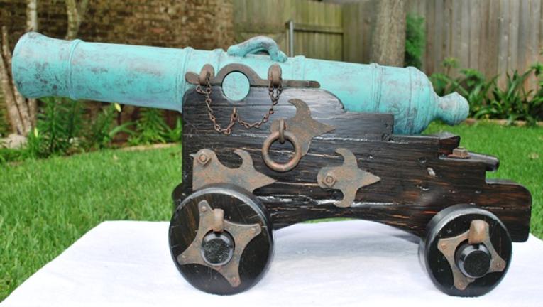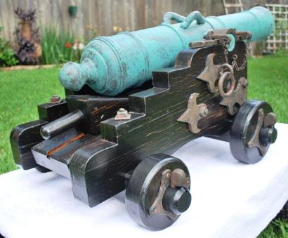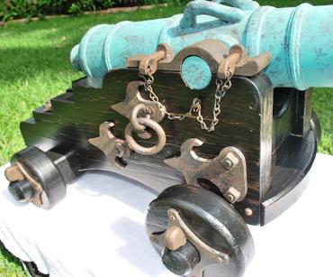 | Non-Firing - One Third Scale British 32 Pounder with Dauphins on Ships/Naval Carriage The barrel is cedar and is lathed turned to 36" long with a drilled 2-5/8" bore. It is faux painted a green patina that gives it an authentic bronze "old world" look. The oak wood carriage is distressed and painted to give it a weathered, battle hardened, aged look. The wood trimmings are faux painted to replicate old weathered metal. The original 32 Pounder cannons defended the British Empire on the high seas in the eighteenth century. $1800.00 (overall measurements are 41" long, 22" wide, 18" tall, and weighs 45 lbs.) |