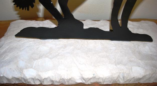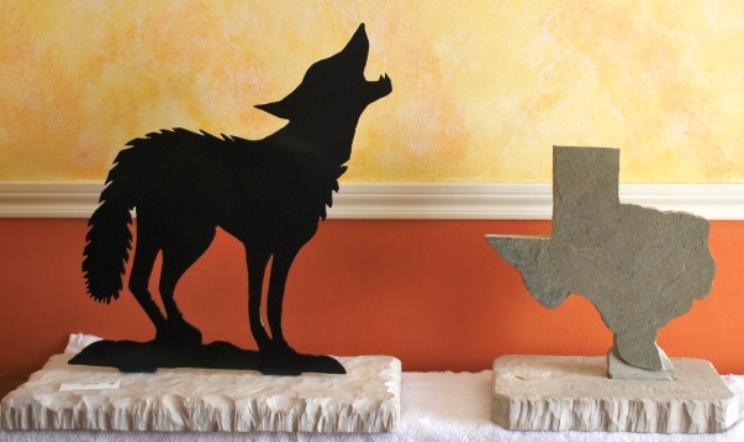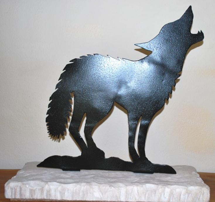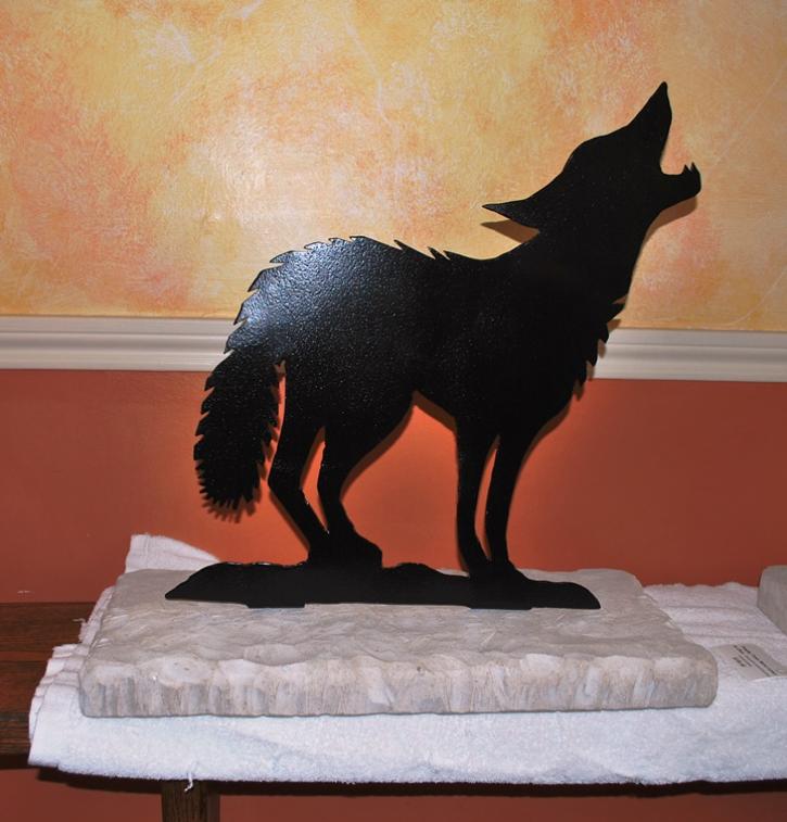 Hand forge silhouette of a coyote attached on a hand carved stone base. Coyote is made out of 1/8" thick heavy metal and painted a black semi-gloss enamel. Limestone base is hand carved. Stainless steel bolts implanted in the stone and nuts secure the coyote to the base. This piece is a great piece in front of your home's entrance door, sitting by the fire place, or just placed in the yard for decoration. Overall Dimensions = 24" tall x 10-1/4" wide x 23-1/2" long $150.00 |